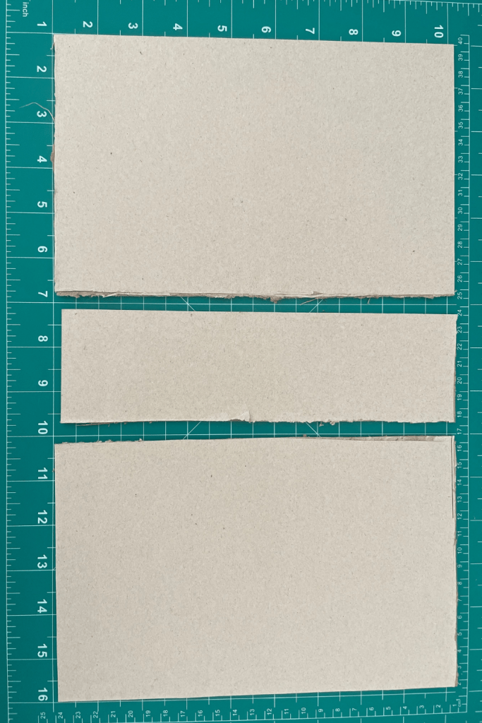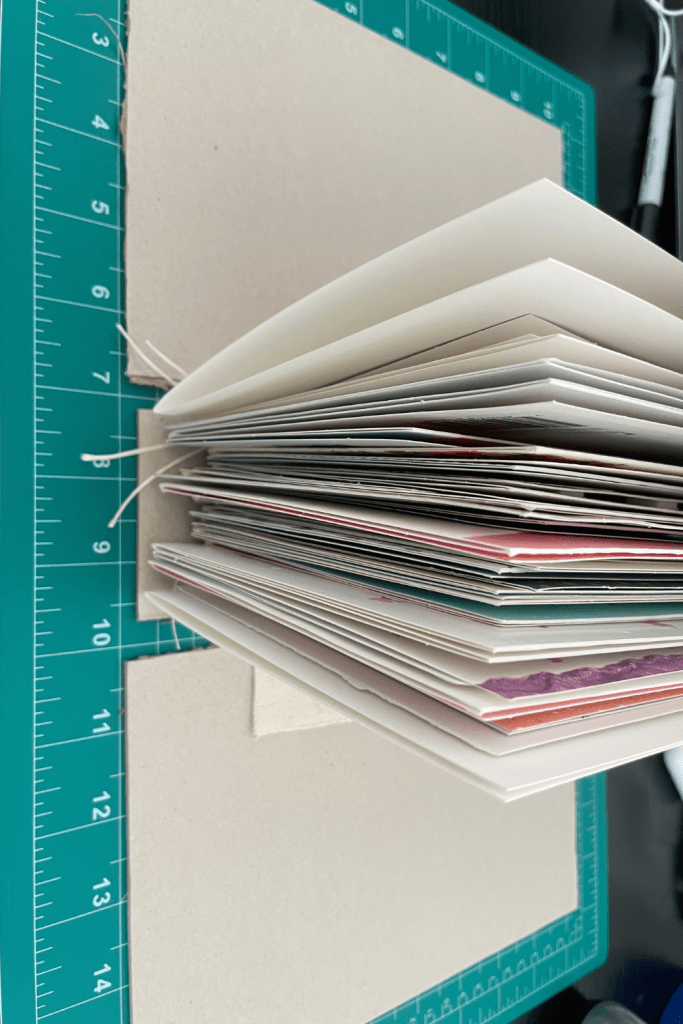 - Measure and cut the spine and book covers. The spine should be slightly larger than the width of the sewn greeting card stack.