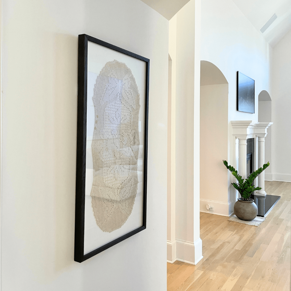 I went to a local professional company, Smyrna Frame & Art Gallery, to have the piece professionally framed. I’ve worked with them in the past to stretch and frame an oil painting I got on vacation in Greece. They did a phenomenal job framing the painting at such an affordable price, so I trusted them to take great care of my mom’s crochet piece. It turned out even better than I expected.