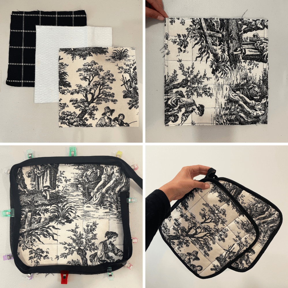 I recently thrifted a beautiful patterned curtain set that I am flipping into a kitchen and table linen set! To kick things off, I started with an easy pot holder pattern. Here is how I created them: