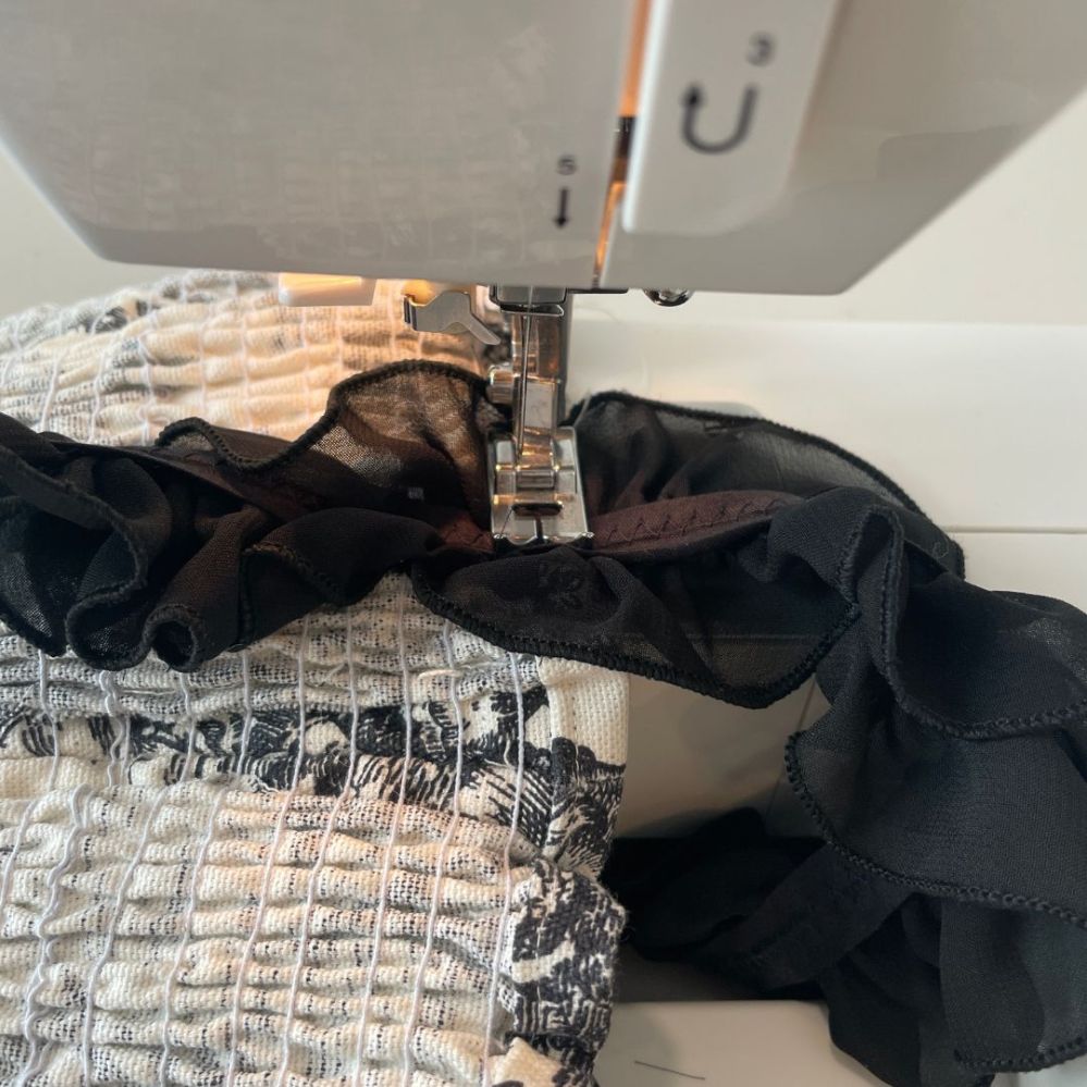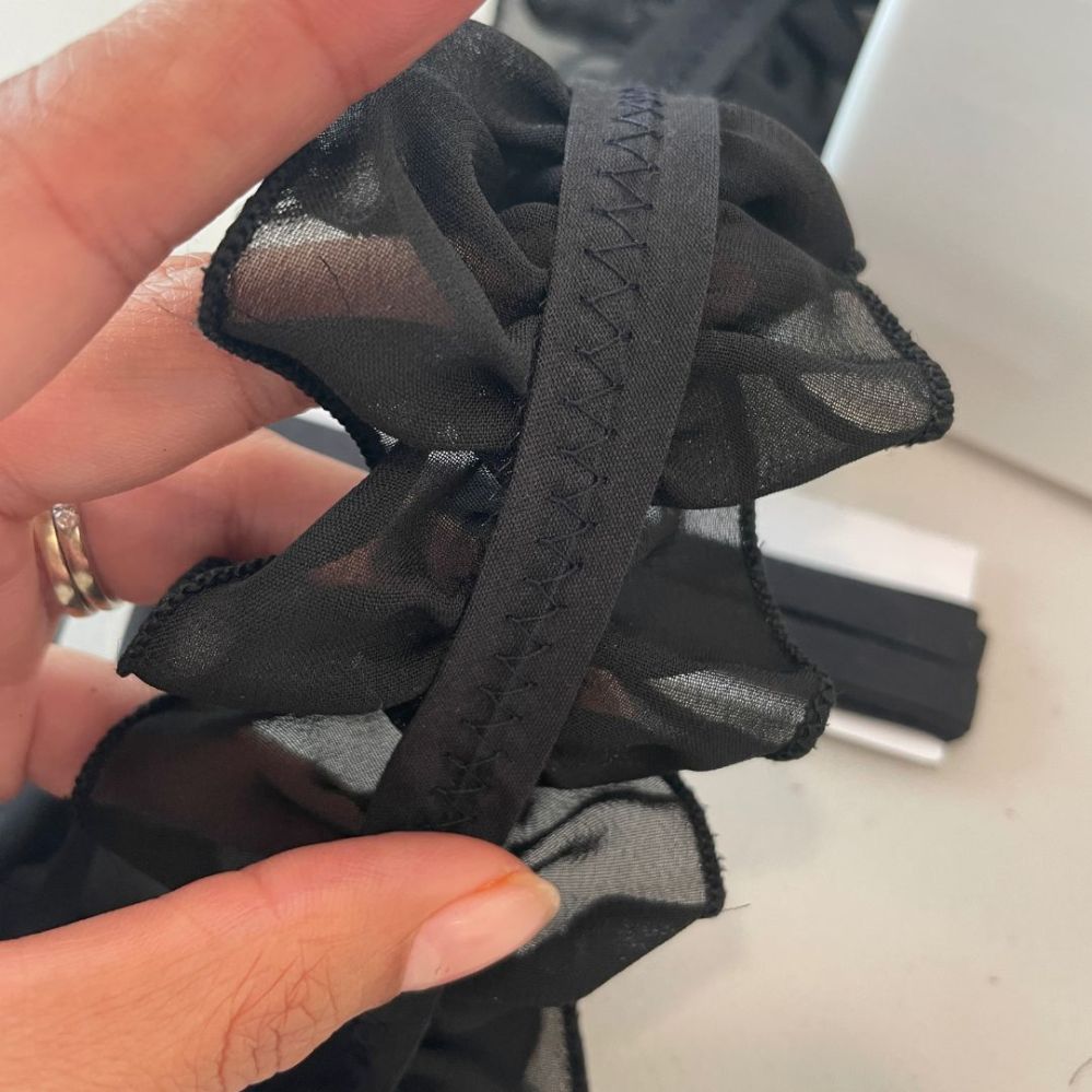 - The ruffle trim I purchased for my straps was super lightweight and cute, but the mesh was very uncomfortable and itchy. I opened up bias tape, placed it on the bottom of the trim to shield the mesh, and sewed a zigzag stitch along the top of the trim.