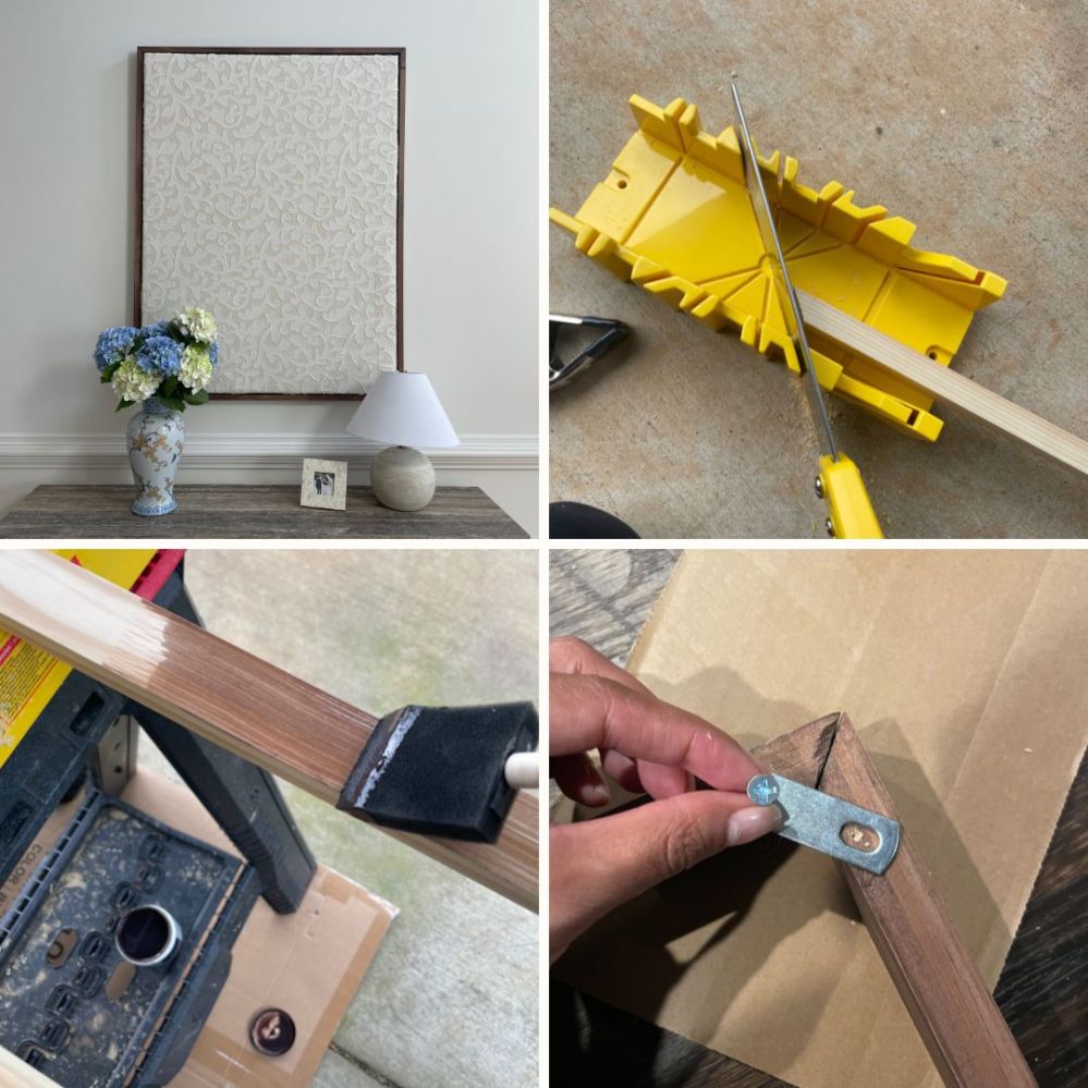 - Using the miter box and saw, cut the pine at a 45 degree angle. Repeat 8 times for all sides of the frame