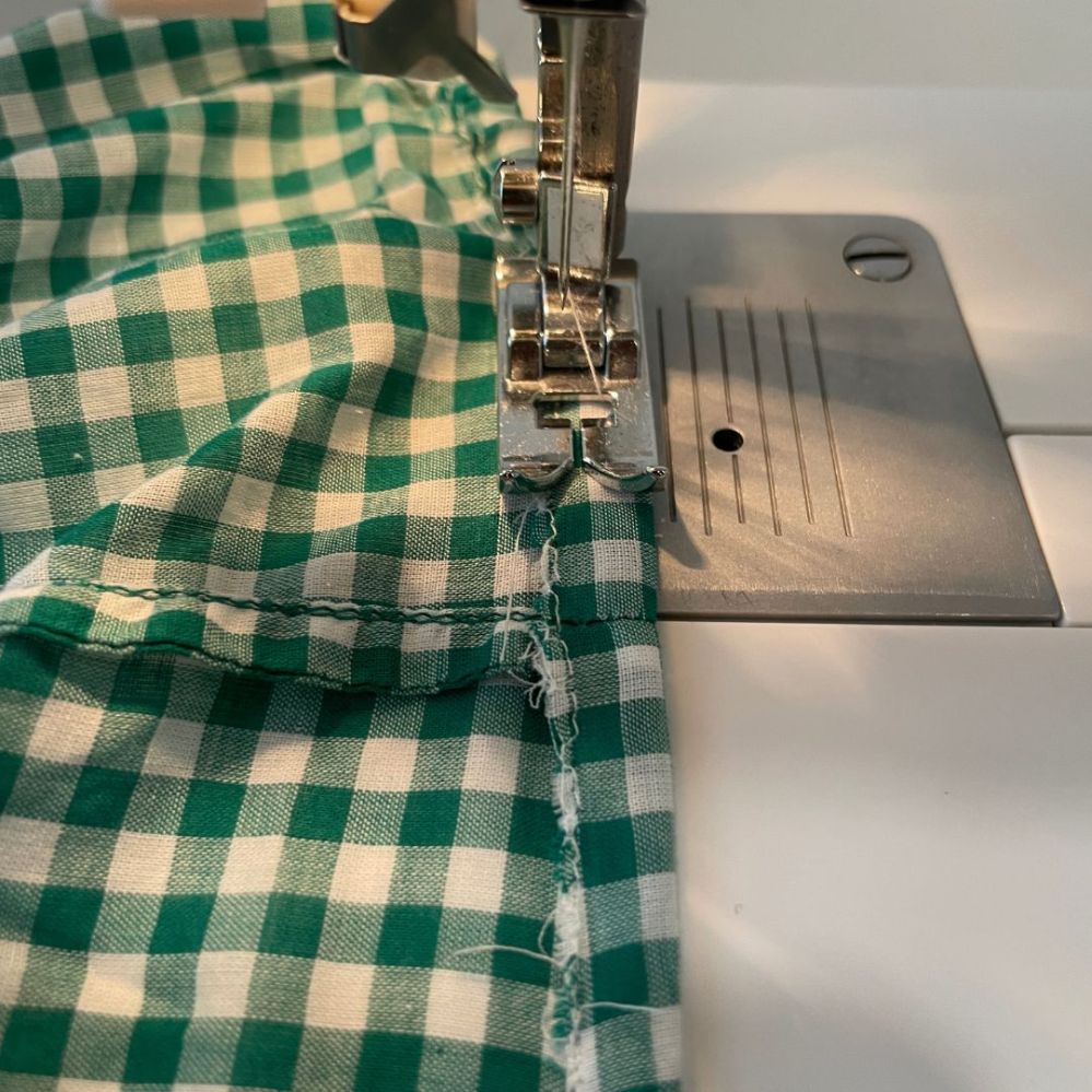 - Serge (or zigzag stitch) along the freshly cut raw edge of the top