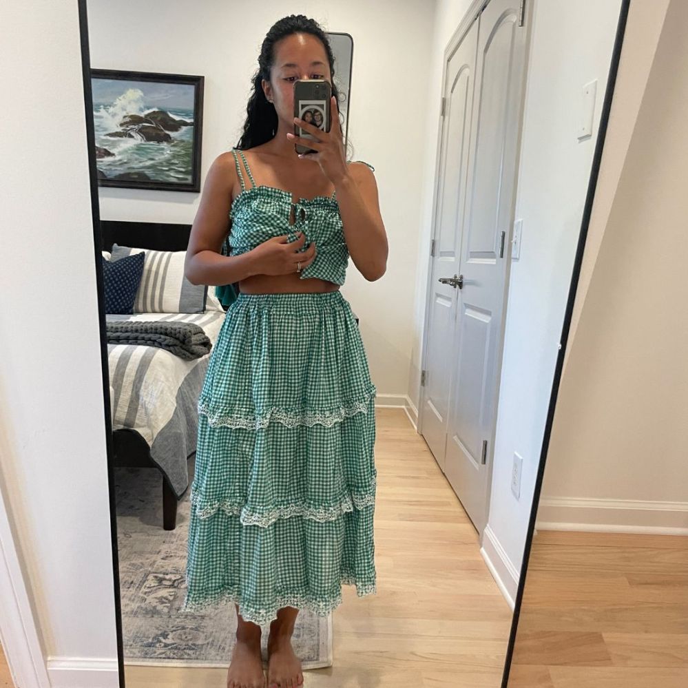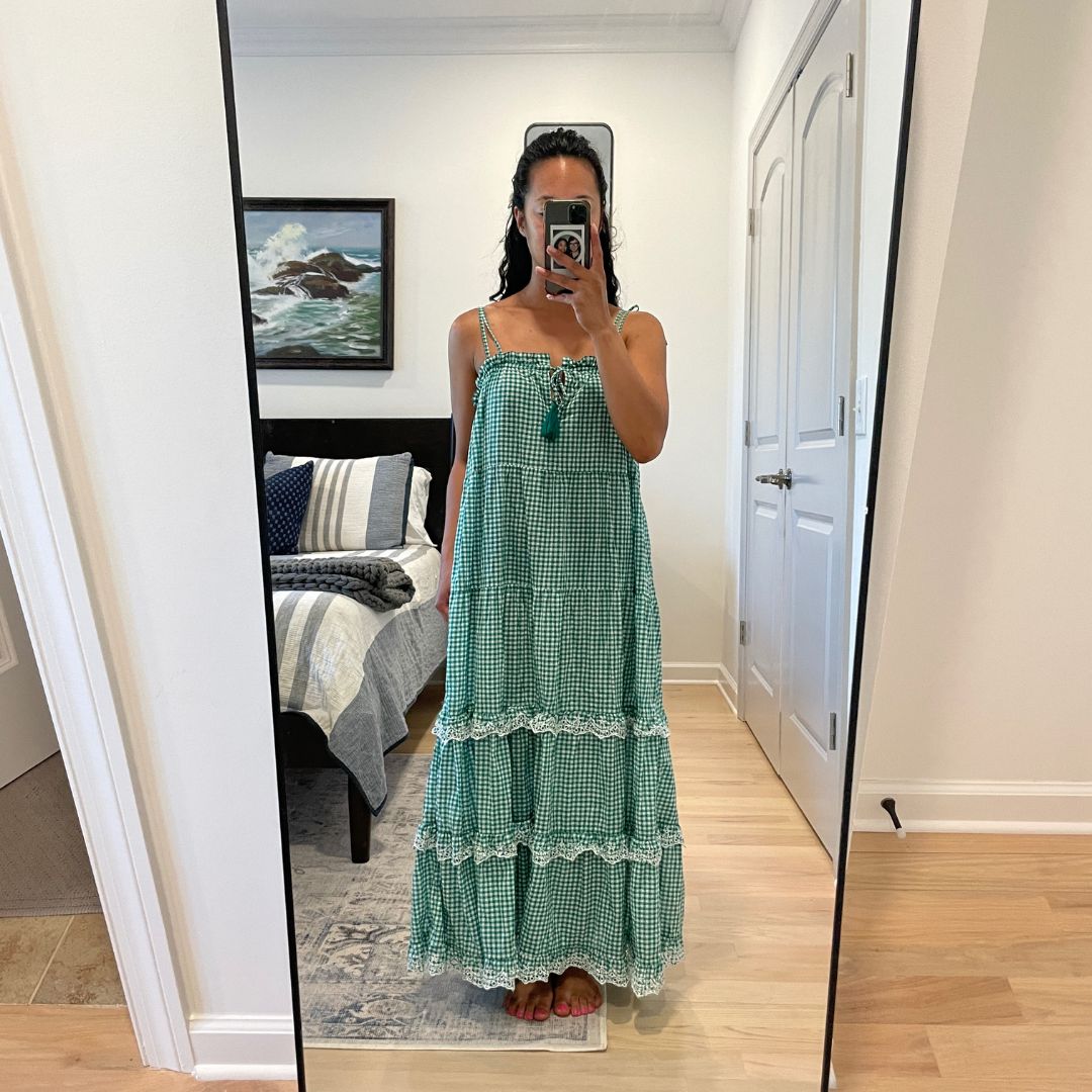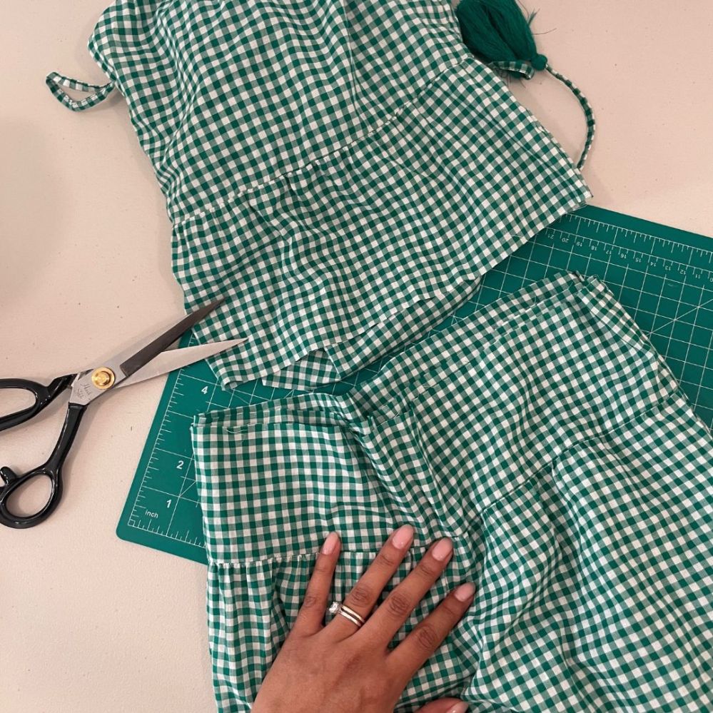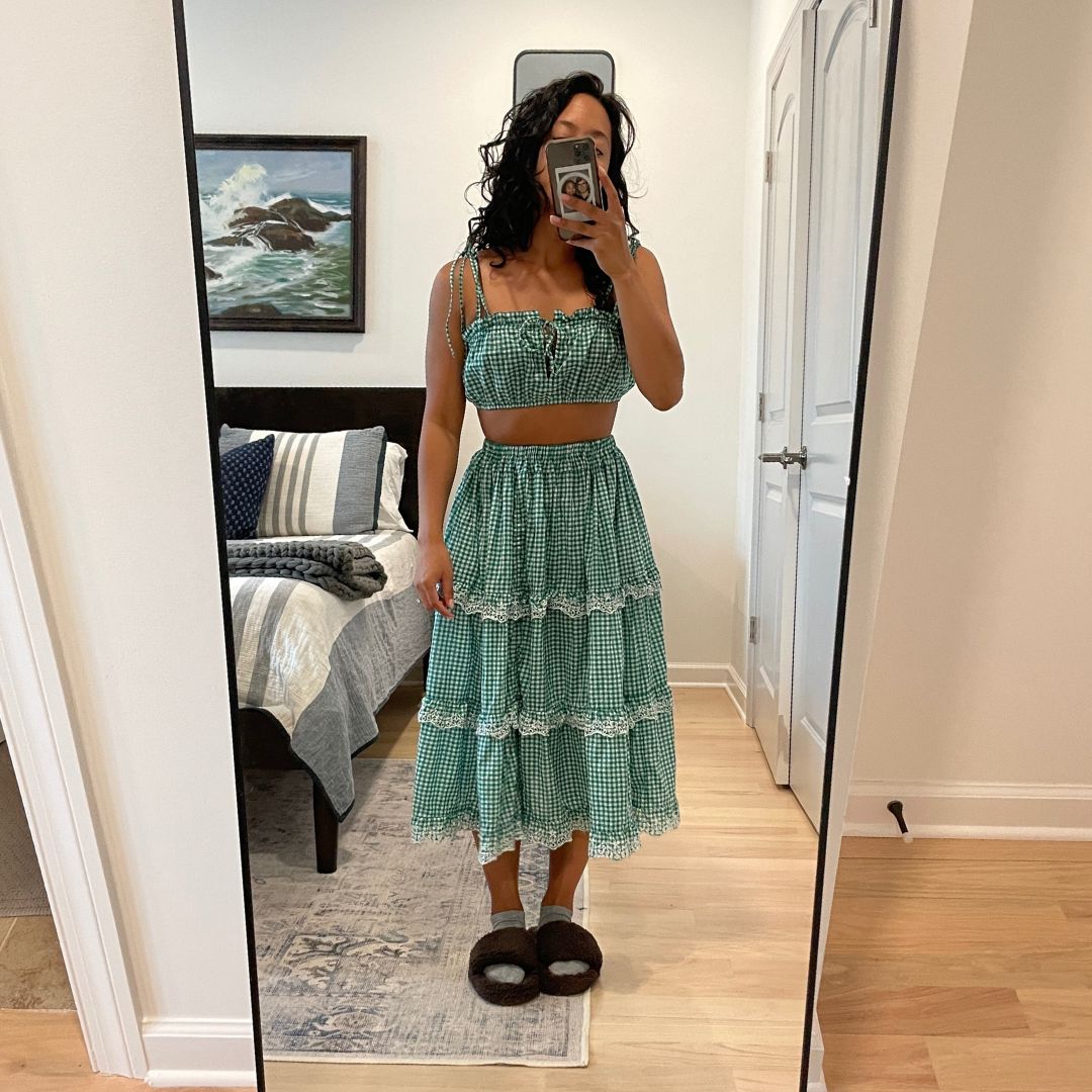 I’m so ready to take on summer in my latest thrift flip! I purchased this J Crew Reimagined gingham spaghetti strap maxi dress for $8 at a thrift store near me and turned it into a matching crop top and midi tiered skirt. I guess you can say I reimagined an already reimagined piece lolz Swipe to see the before and after below.