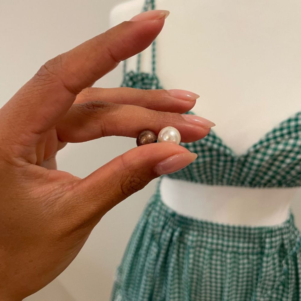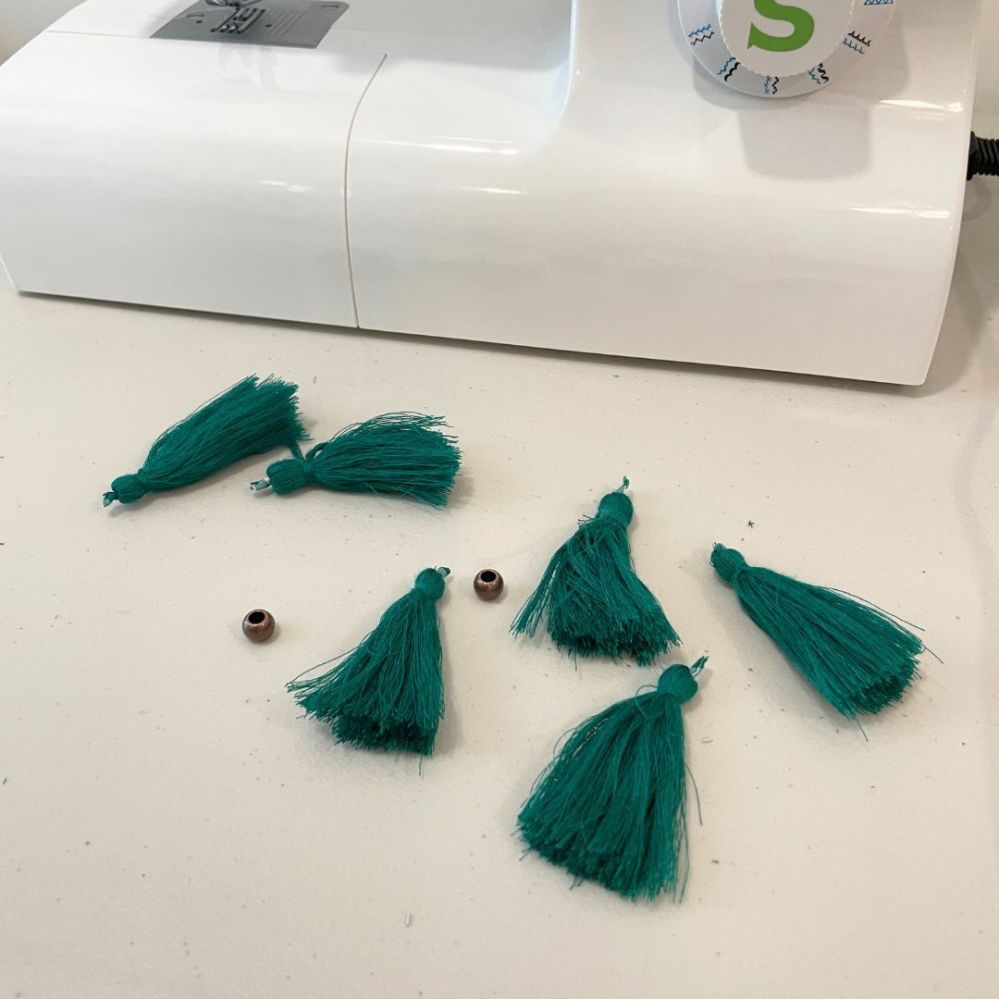 I wasn’t the biggest fan of the green tassels on the top. It looked a little disconnected from the skirt and it’s also not something that screams “Lina”. So I took those off along with the antiqued color beading and replaced them with faux pearl beading – something that screams “Lina”. I thought the addition of the pearls brought the looks together.