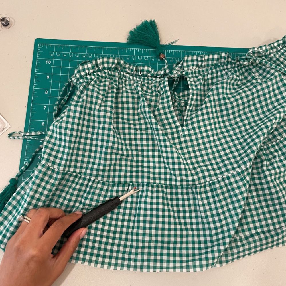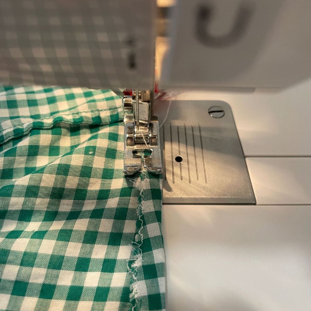 - Beginning at the side seam of the top, sew a channel for the elastic using a straight stitch leaving a 1 inch gap